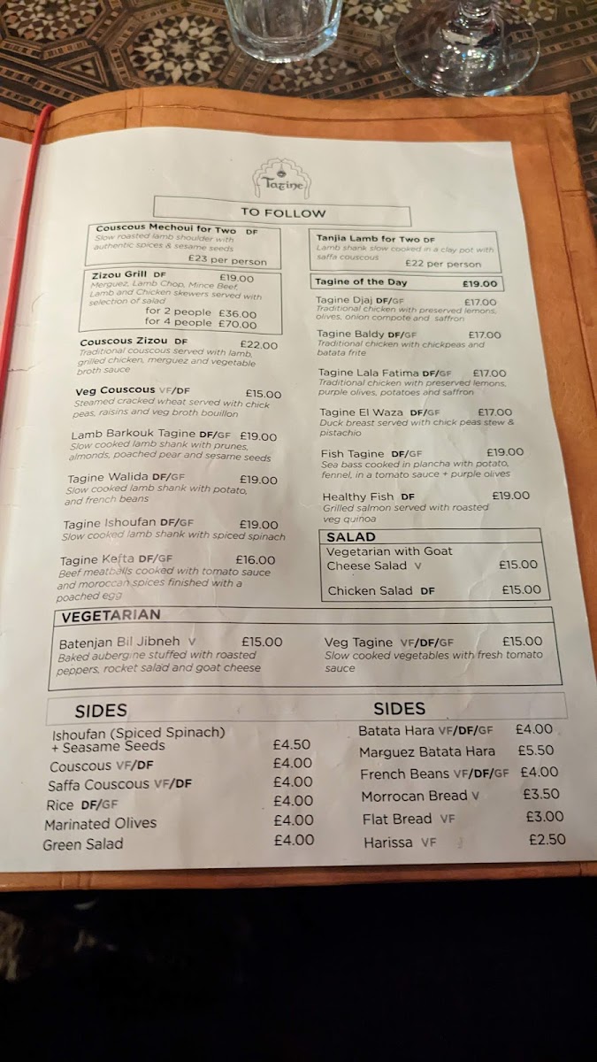 “ Went here for an Xmas work do last night and only had the table for around 2 hours. Was really cosy upstairs in the corner with a low table. It's BYOB which is great and the decor felt very authentic. Food was delicious and tasted better than the tagines I'd had in Morocco a couple of months ago. The starters were delicious and the zaalouk was wonderfully smoky. The beetroot cubes had a dash of rosewater which was lovely combination. I was slightly disappointed that the pitta bread was shop bought and thought they would have made their own khobz. My seabass tagine tasted like it had been slow cooked for hours and craving another one today. The addition of fennel paired really well with the fish. My colleagues had lamb on the bone served with a whole pear which looked like a great combination. I was a little disappointed that the sweets tasted a mass produced (not sure whether they were), but they were totally overshadowed by the mains. Tagine is definitely worth a revisit and would like to try the a la carte menu next time. ”